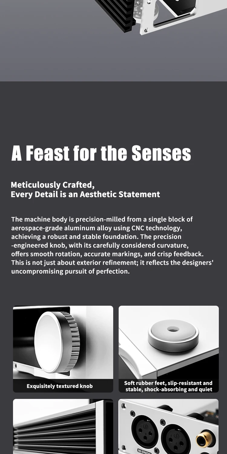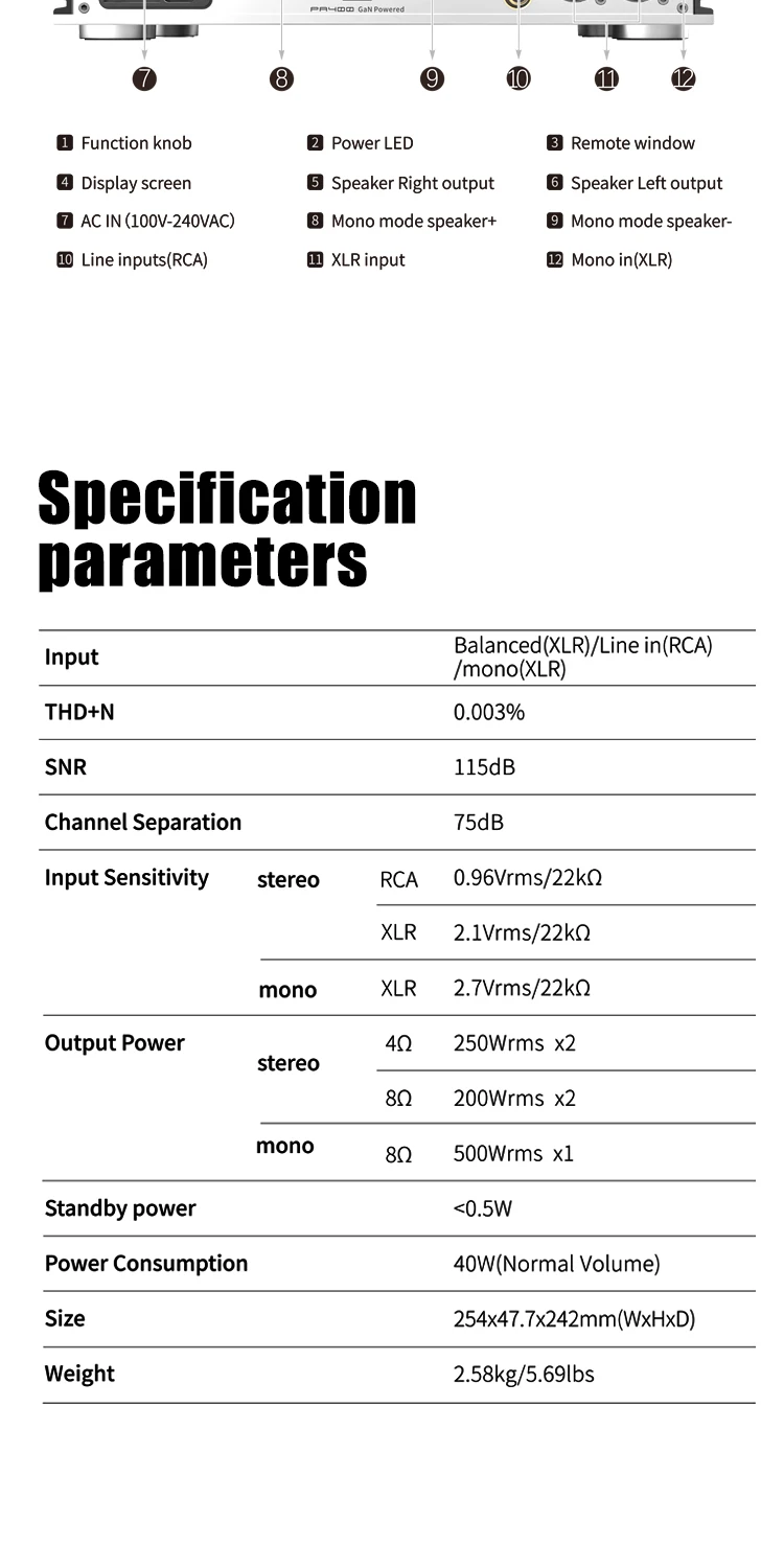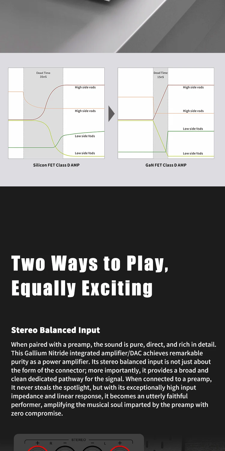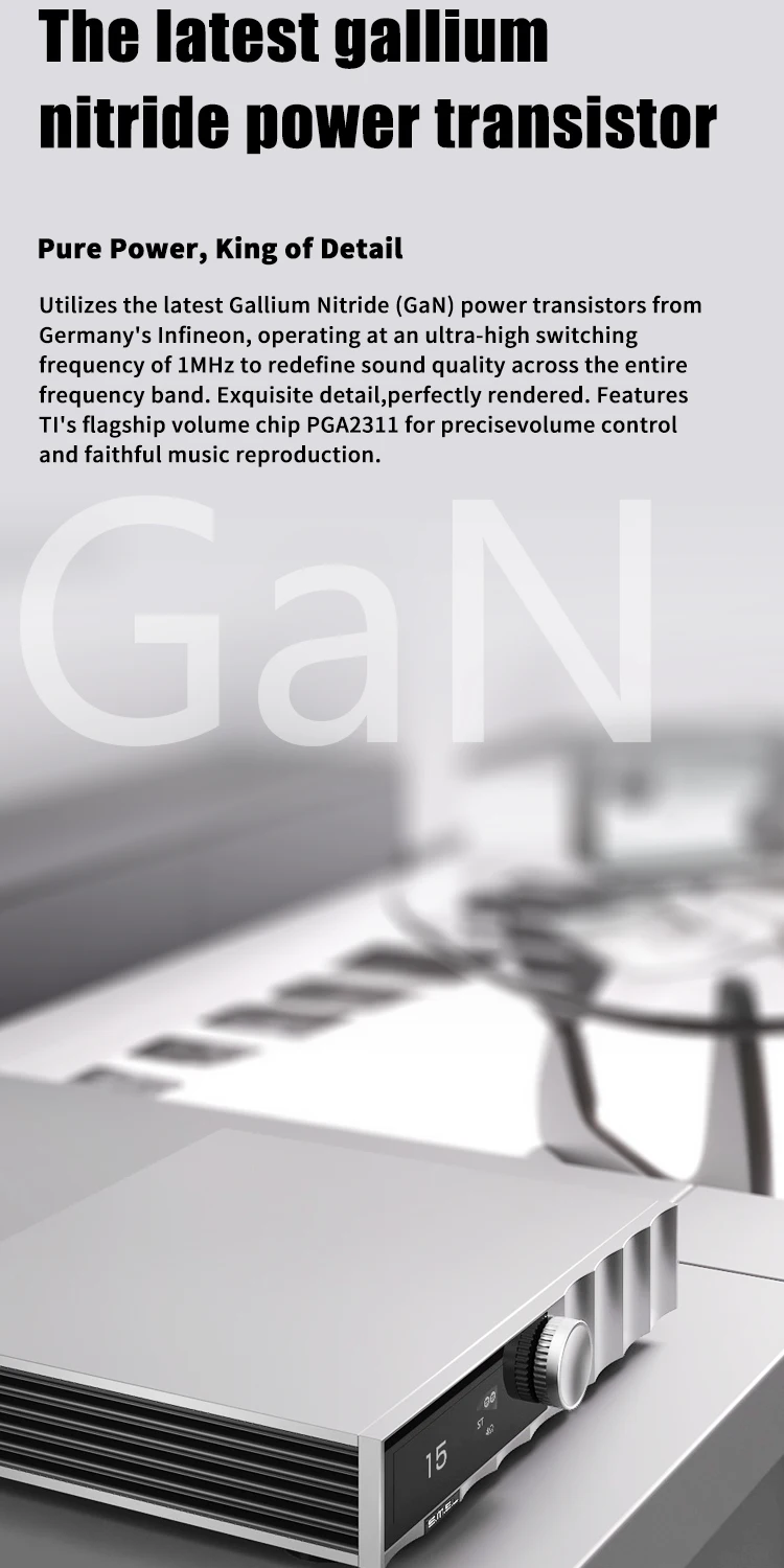 Infineon GaN Power Transistors ~1 MHz Switching TI PGA2311 Volume IC Balanced XLR / RCA In Bridge-Mono via XLR Aerospace-Grade Aluminum 200 W ×2 @ 8 Ω <0.5 W Standby
