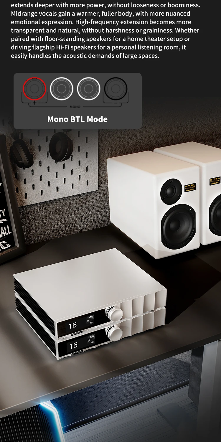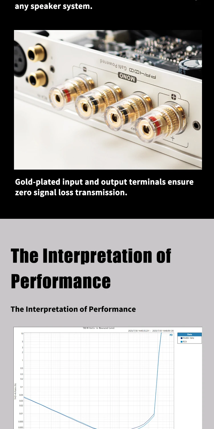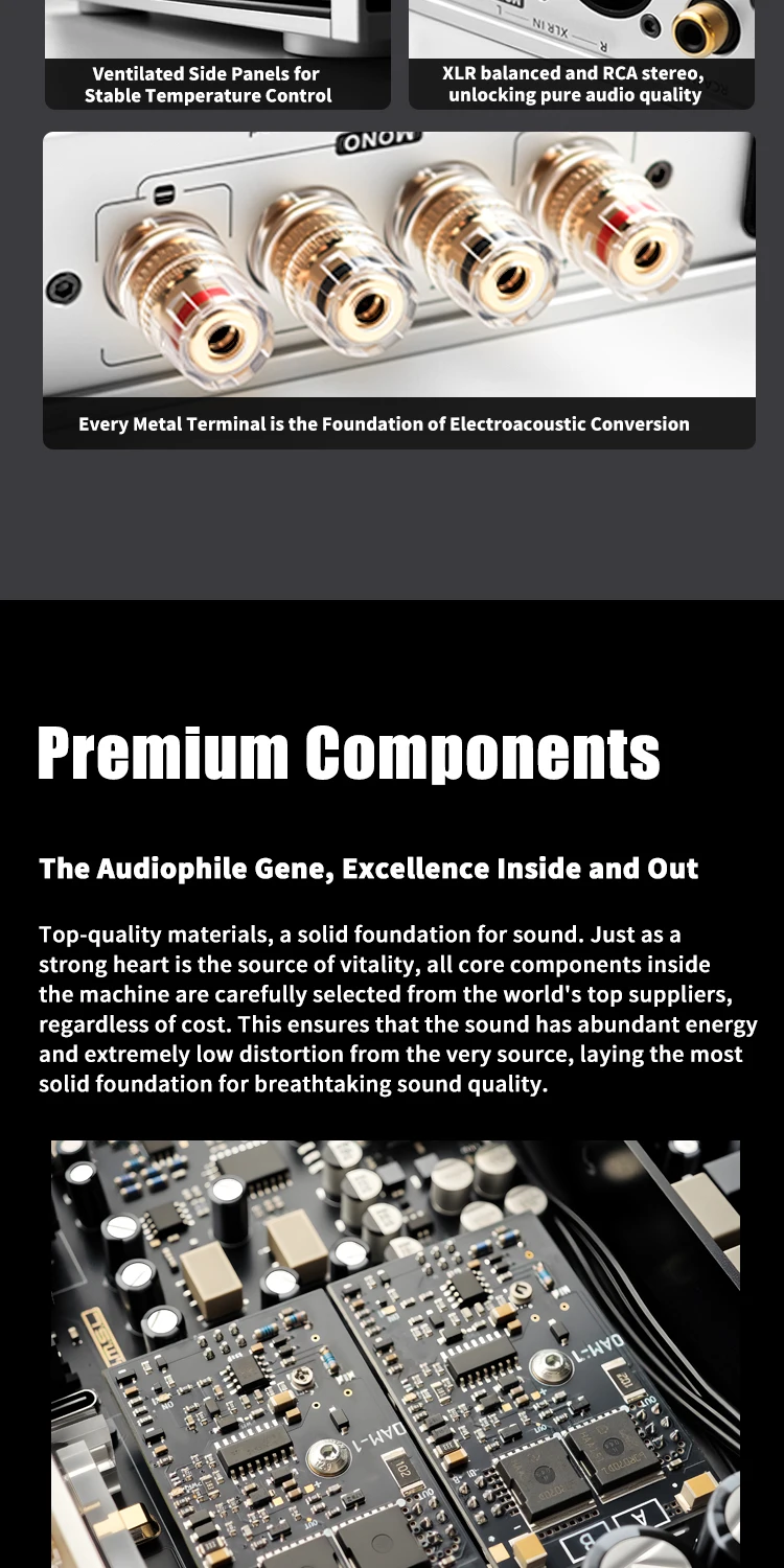 • Premium parts throughout: Components are sourced from top suppliers to ensure abundant current delivery and ultra-low distortion from the source to the speaker terminals.