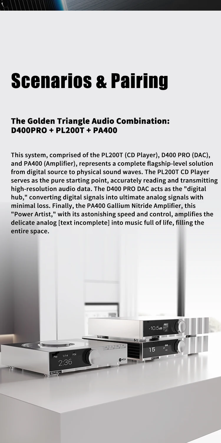 Create the “Golden Triangle” SMSL stack: PL200T CD transport → D400 PRO DAC → PA400 power amplifier. From bit-perfect readout to analog finesse to GaN muscle, it’s a complete flagship path from source to speakers.