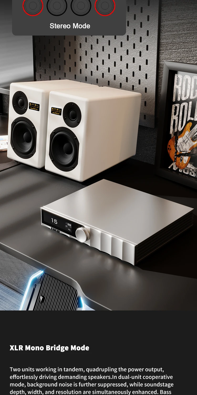 • XLR Bridge-Mono: Run two PA400 units—one per channel—in XLR mono mode to dramatically increase power (up to 500 W @ 8 Ω per channel) and soundstage scale, with deeper bass grip, richer midrange body, and airier treble extension.