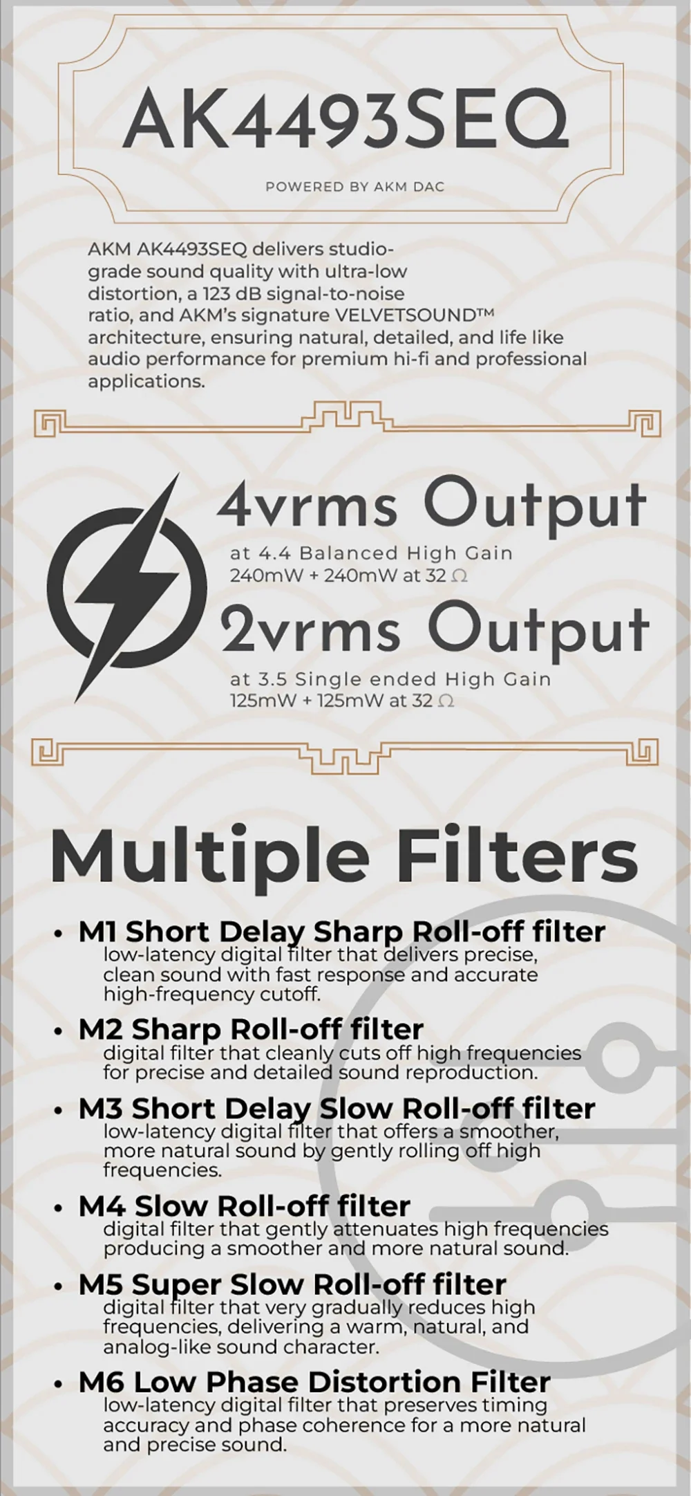 • AKM AK4493SEQ DAC: Ultra-low distortion with 123 dB SNR, delivering natural, detailed, lifelike sound.