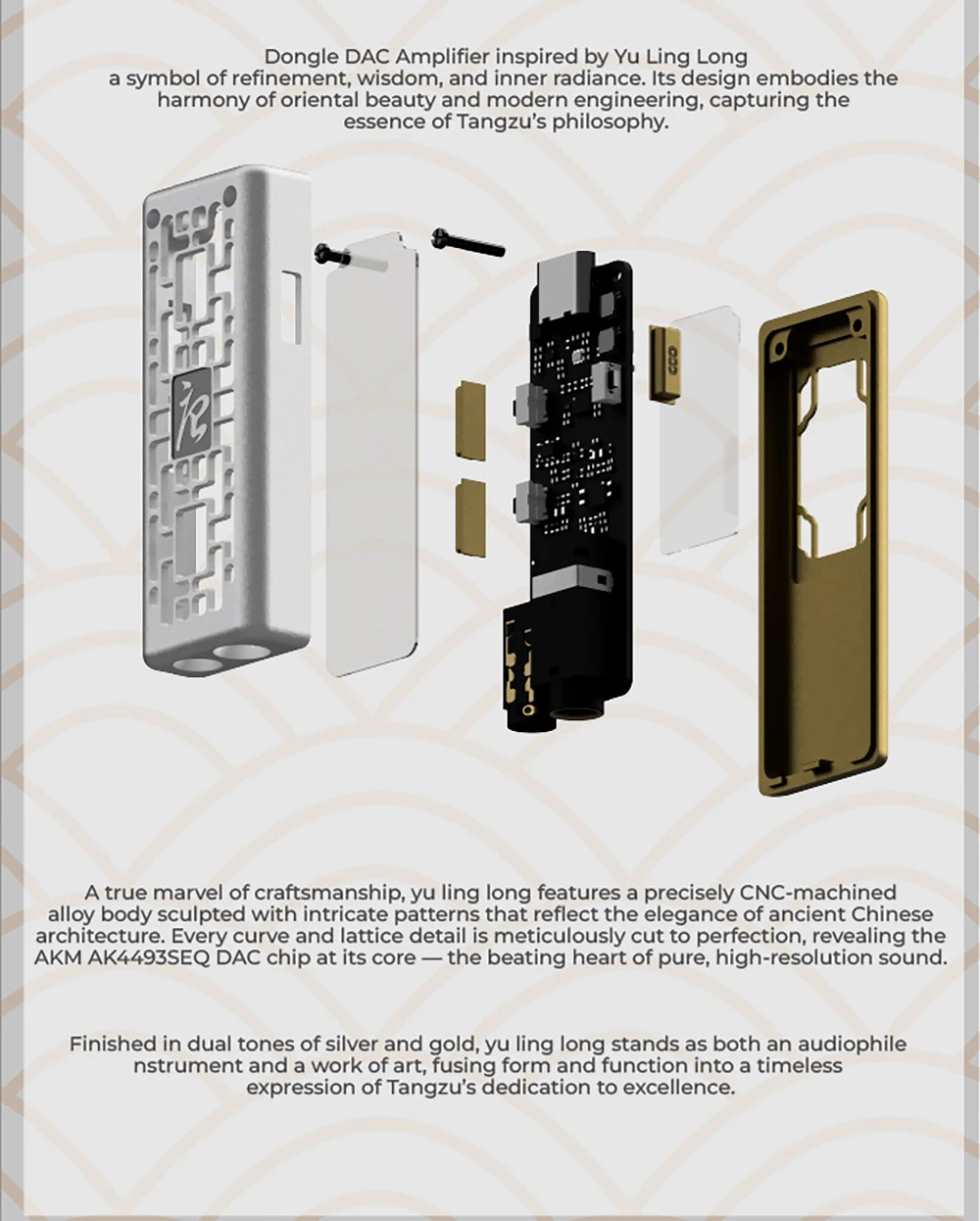Inspired by Yu Ling Long—a symbol of refinement and inner radiance—Yulinglong’s CNC-sculpted alloy shell features intricate oriental lattice patterns. A clear window reveals the AK4493SEQ “heart,” fusing modern engineering with classic aesthetics in a timeless, dual-tone (silver & gold) finish.