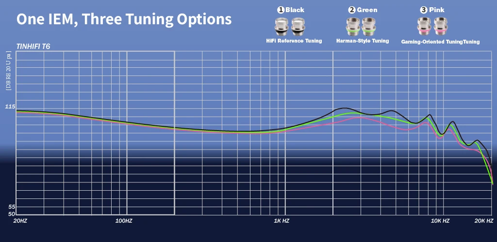 TINHIFI T6 offers optimal performance across gaming earbuds, professional monitoring, and music listening scenarios. Each tuning style and nozzle precisely controls bass depth, impact, treble extension, soundstage, and imaging, ensuring balanced frequency response, low distortion, wide soundstage, high-resolution sound, and fast transients. One pair of T6 functions as three separate earphones, providing versatile listening experiences. The detachable cable adds durability and convenience, making T6 ideal for audiophiles, gamers, and music producers.