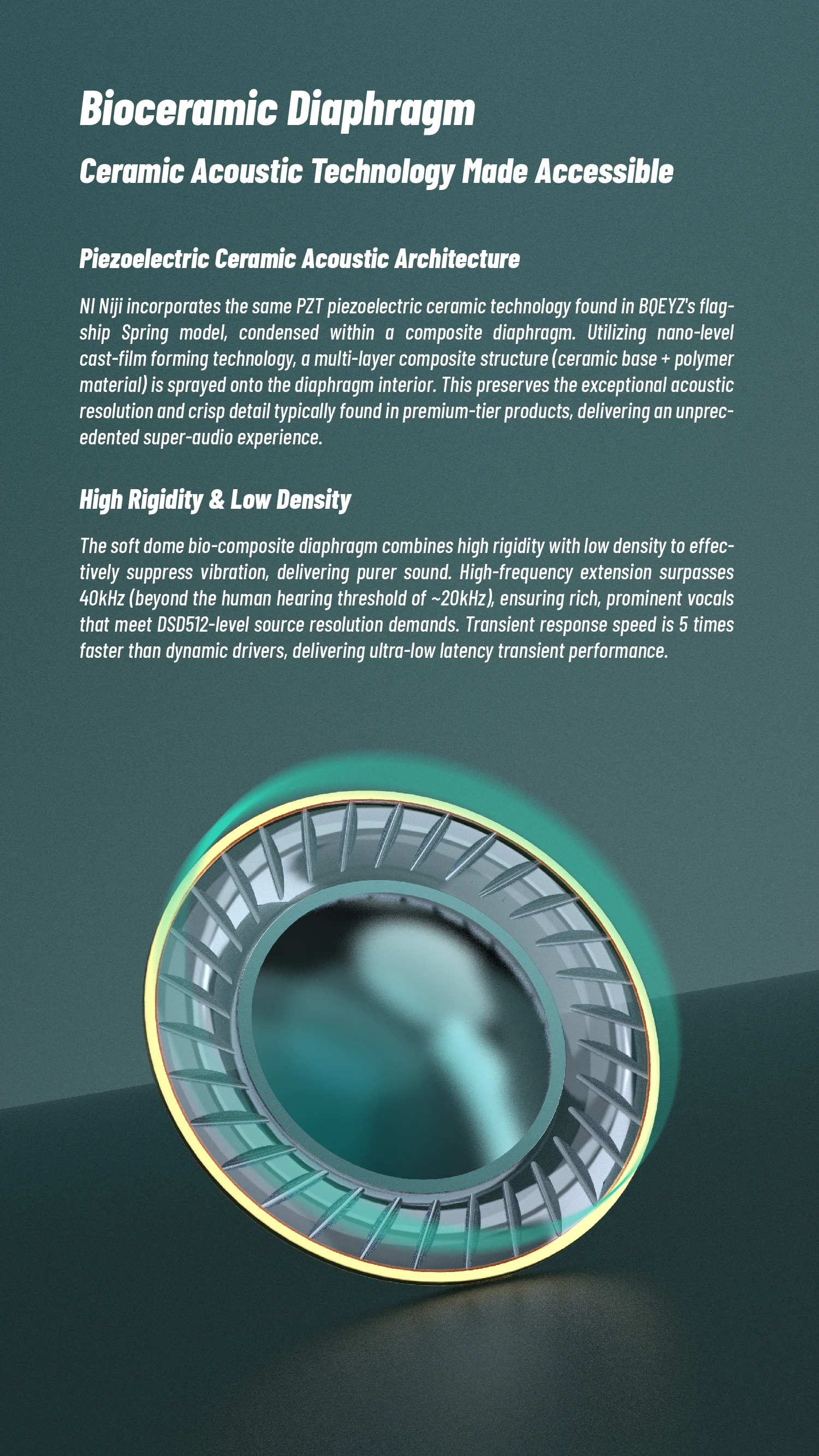 The BQEYZ NI integrates a bioceramic composite diaphragm with PZT piezoelectric technology derived from BQEYZ’s flagship designs. A nano-layer cast-film structure (ceramic base + polymer) is applied to the inner dome, combining high rigidity and low mass for fast transients, extended treble, and clean, low-distortion mids. A dual-chamber 11 mm dynamic driver manages airflow front and rear to boost bass depth, suppress dynamic compression, and sharpen imaging.