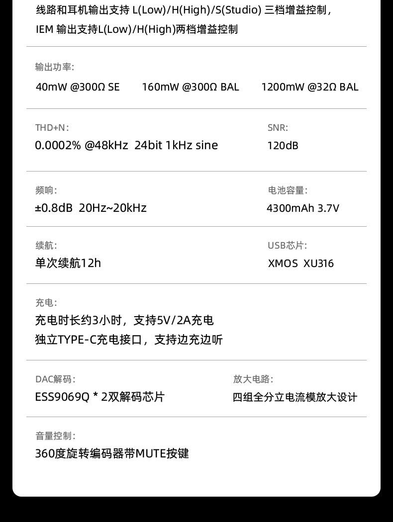 Dual ES9069Q (Dual-Mono) Current Mode Amp ×4 (Discrete, Balanced) XMOS XU316 USB PCM 768/32 • DSD512 MQA Full Decode Bluetooth 5.4 • Snapdragon Sound aptX Adaptive/HD • LDAC 3.5/4.4/6.35 HP Out 3.5 SE In • 4.4 BAL In Stereo Recording 48 kHz/24-bit Dual USB-C (Charge+Data) 4300 mAh • 12 h