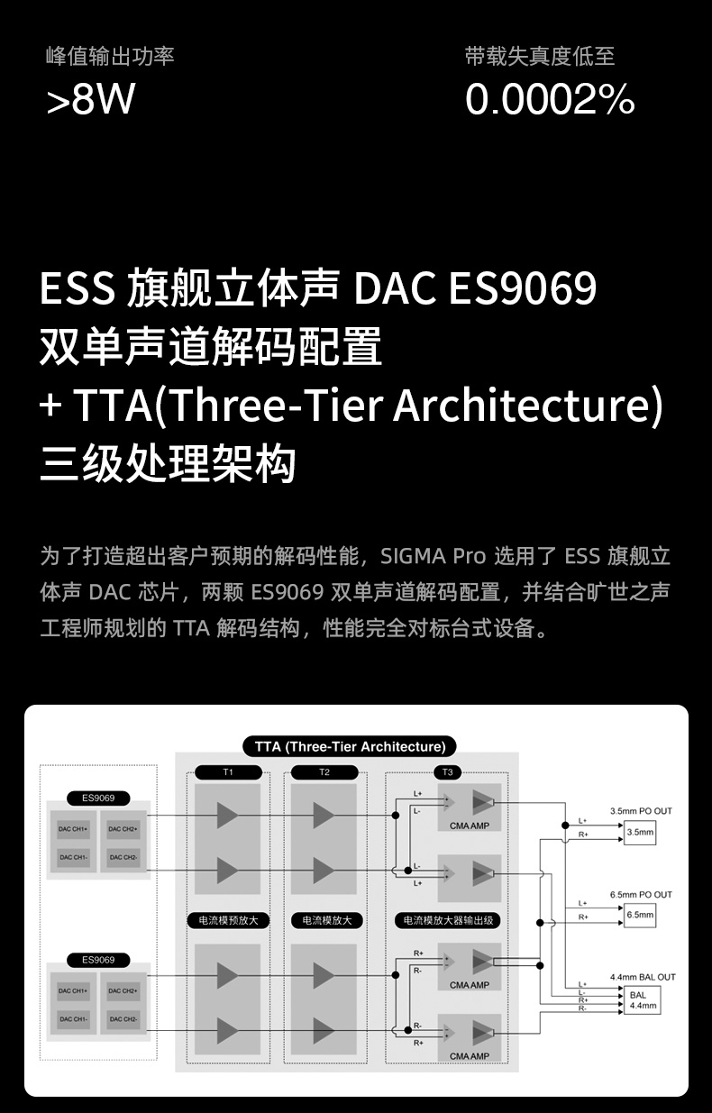 • Patented Current Mode Amplifier + TTA: Four groups of fully discrete, fully balanced current-mode output stages under Questyle’s Three-Tier Architecture (TTA) deliver massive headroom, ultra-low distortion and speed.