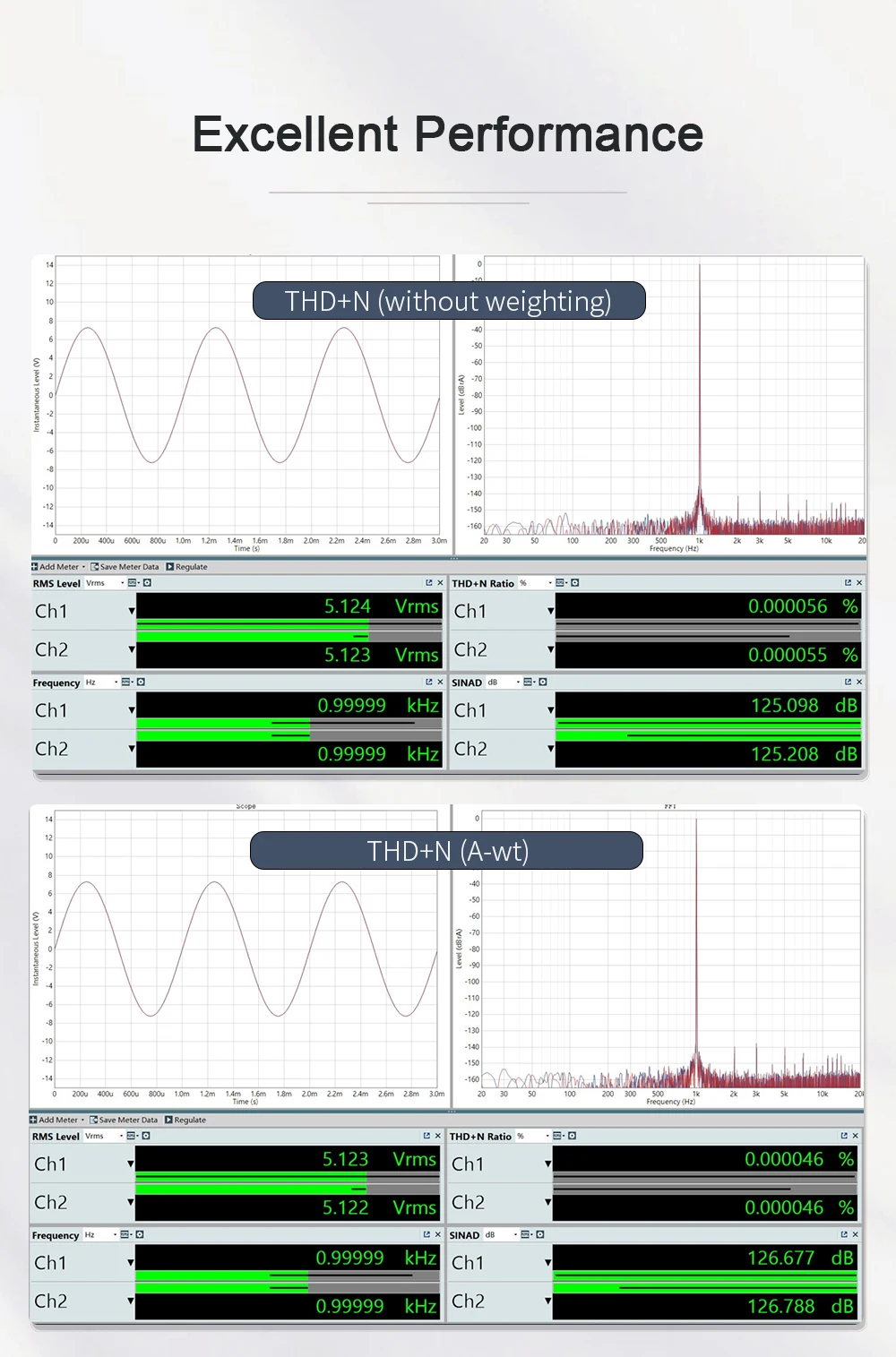 THD+N XLR: 0.00005% (-125dB) | RCA: 0.00007% (-123dB)