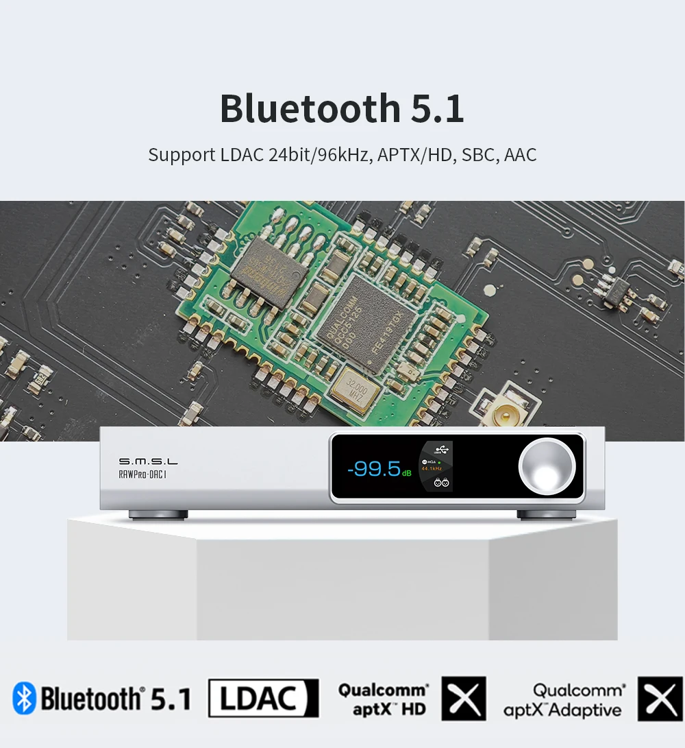 ESS ES9039MSPRO DAC MQA Decoding DSD512 & PCM768kHz XMOS XU-316 USB Bluetooth 5.1 LDAC/aptX Low Phase Noise Crystal Oscillator MQA-CD Decoding (Optical/Coaxial/AES/EBU) Full Aluminum Chassis Remote Control Support Firmware Upgradeable