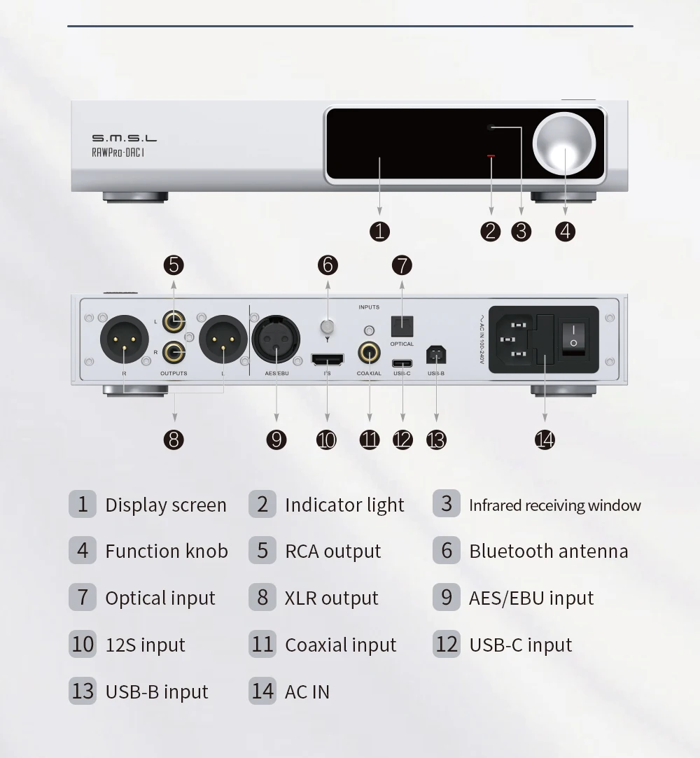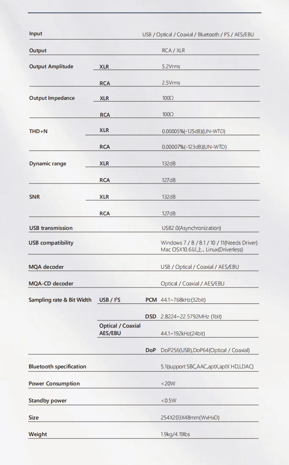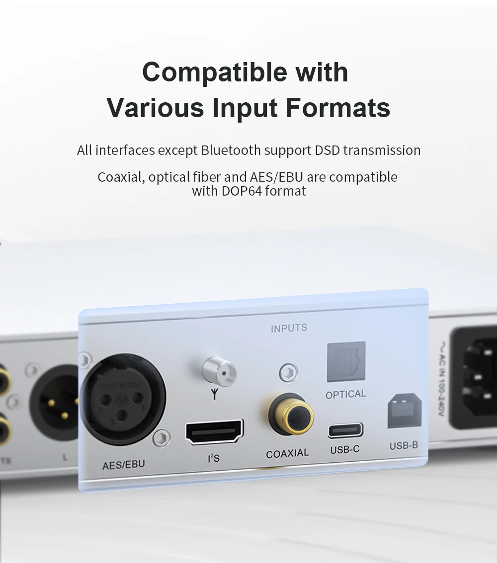 • Multiple Inputs & Outputs: Supports USB, Optical, Coaxial, Bluetooth, and AES/EBU inputs. Outputs via XLR and RCA.