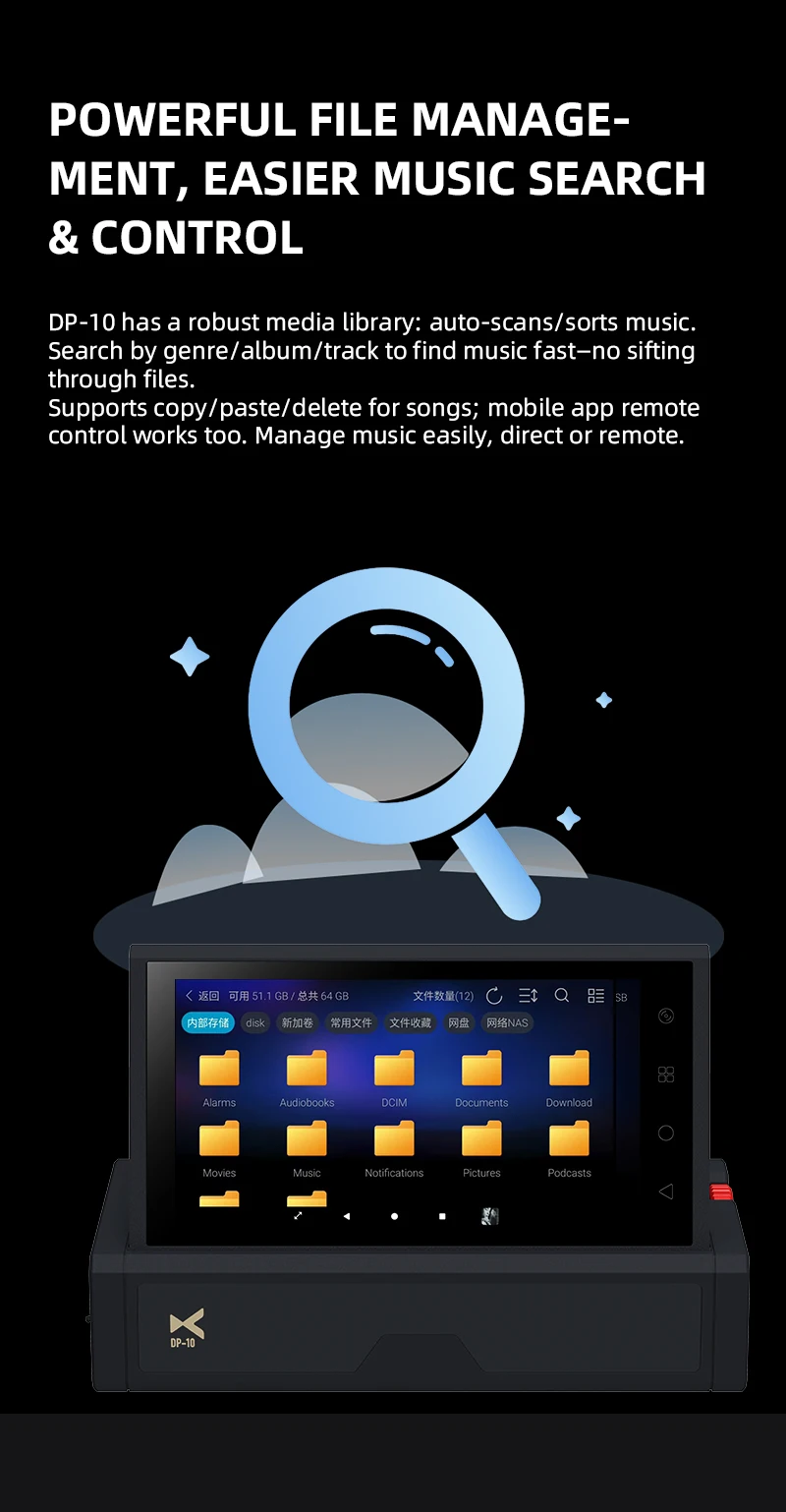 Navigate through your music library effortlessly with the device's intuitive HD touchscreen interface.