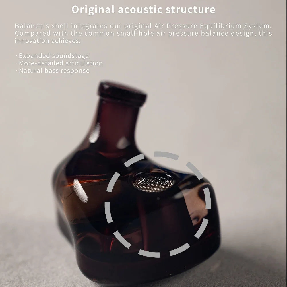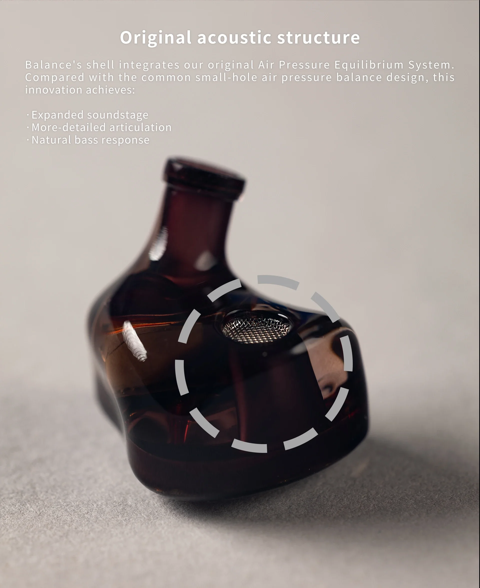 Original acoustic structure integrates an Air Pressure Equilibrium System in place of standard small-vent designs. Benefits include an expanded soundstage, more detailed articulation, and a natural bass response without added bulk.