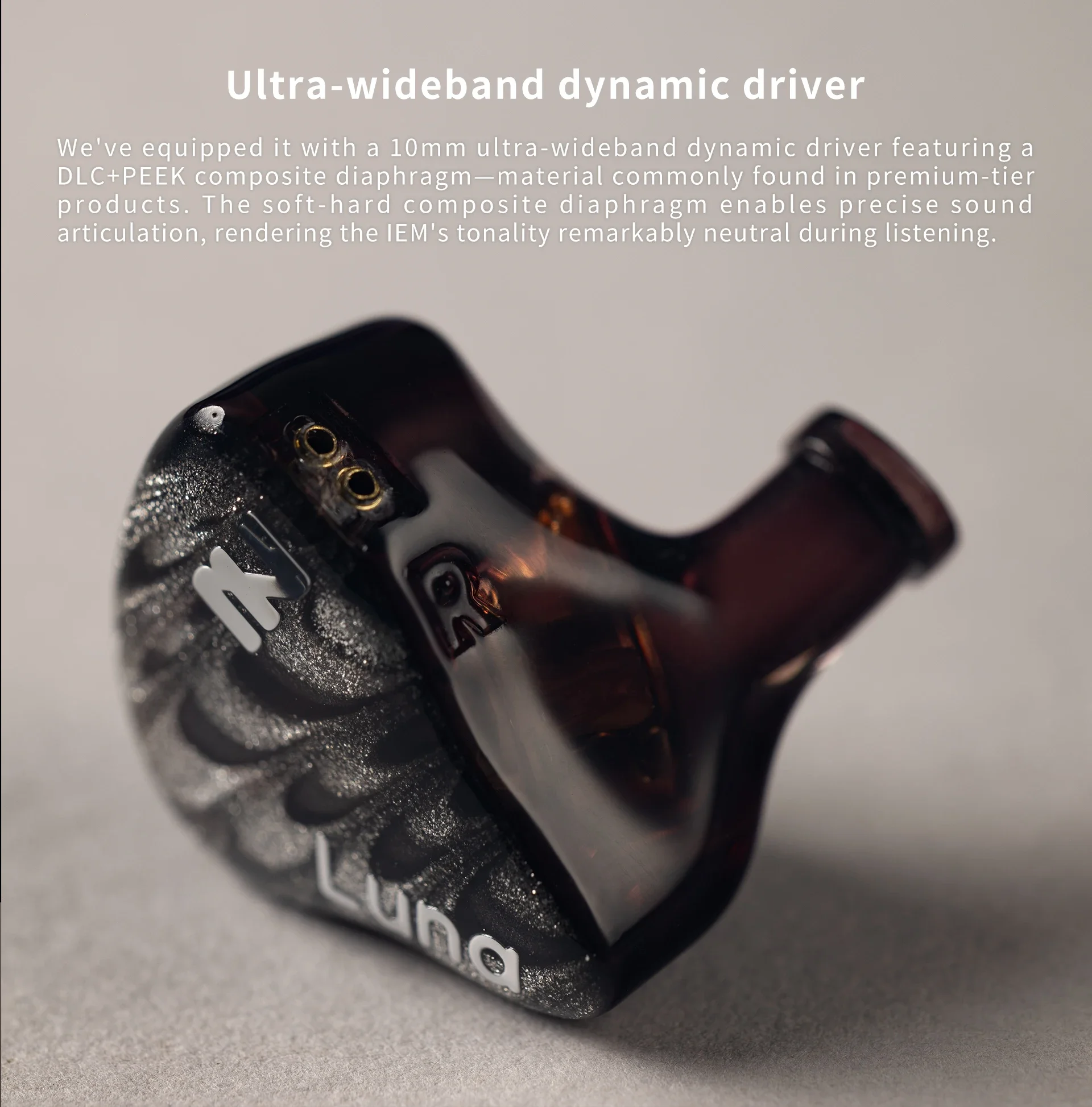 Equipped with a 10 mm ultra-wideband dynamic driver featuring a DLC-PEEK composite diaphragm—materials once reserved for premium tiers. The soft-hard diaphragm combination enables precise sound articulation and remarkably neutral tonality.