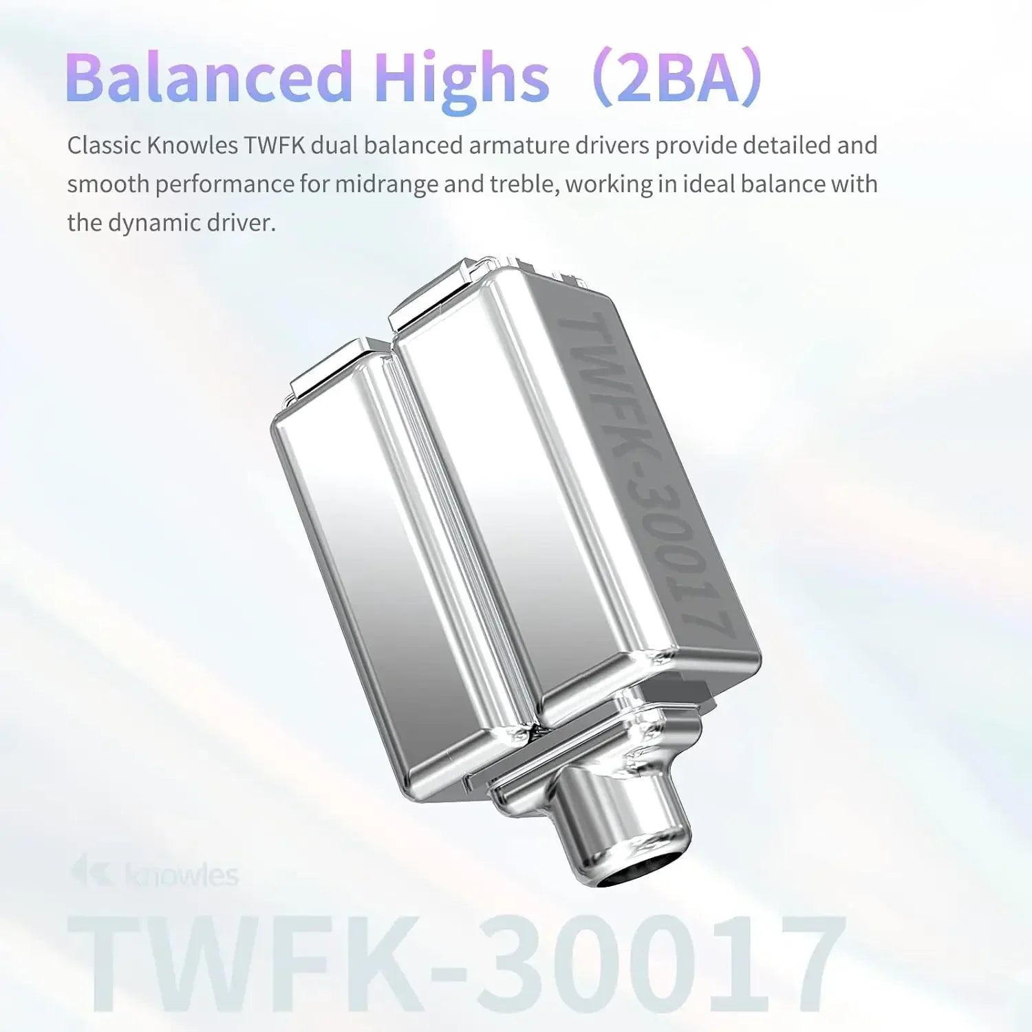 • Hybrid Driver Configuration: Combines 1 dynamic driver (10mm) for rich bass with 2 Knowles TWFK-30017 balanced armature drivers for clear and precise mid-to-high frequencies.