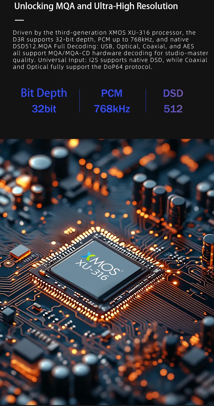 • PCM 768kHz/32Bit & DSD512 Support: Handles the most demanding hi-res audio formats natively, from standard FLAC and ALAC to DSD64 through DSD512, ensuring no detail is lost in decoding.