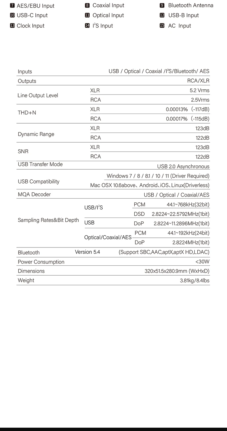 Dual ROHM BD34302EKV DSD512 PCM 768kHz/32Bit Balanced XLR Output RCA Output USB-B & USB-C Input Optical & Coaxial Input Bluetooth All-Metal Chassis Hi-Res Audio