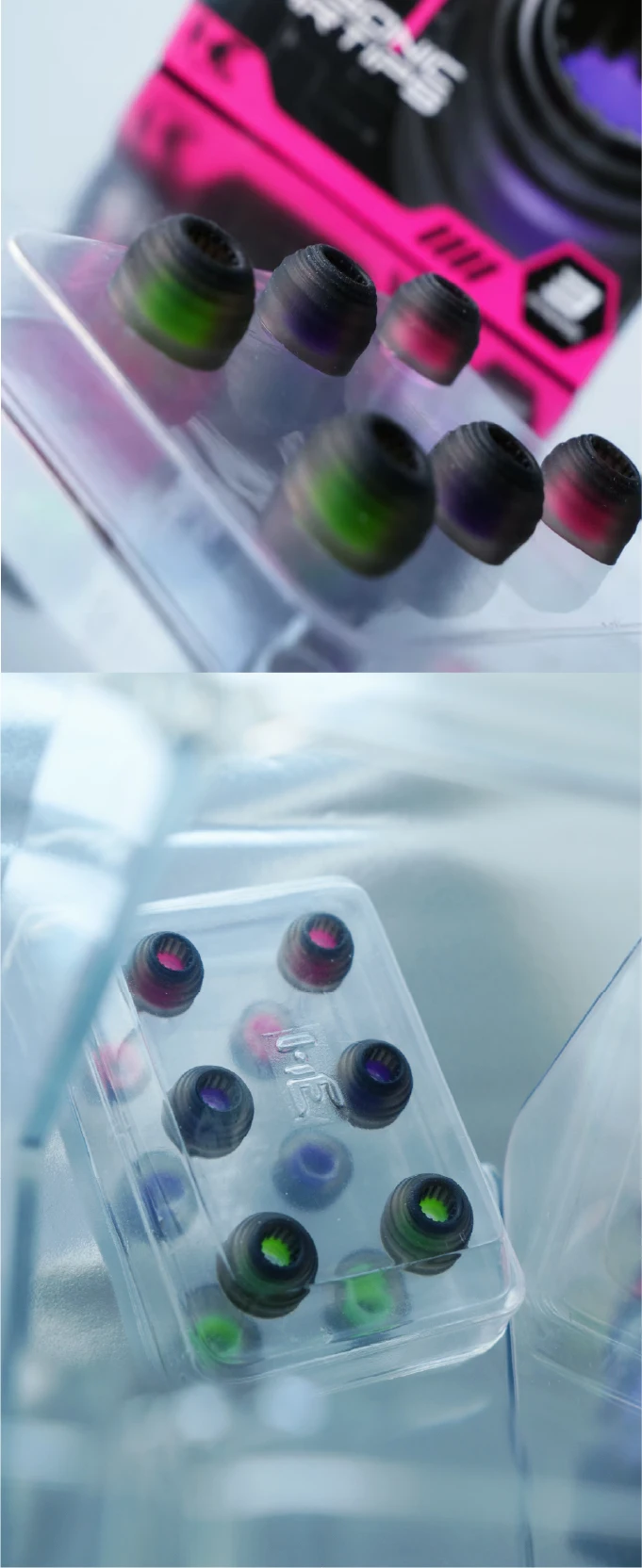 Earbud tips made from high-quality medical-grade silicone offer a safer, more comfortable, and more durable fit compared to standard materials, while also providing more consistent sound performance. This material also allows for precise implementation of advanced designs (such as bellows) while providing users with confidence in long-term performance.