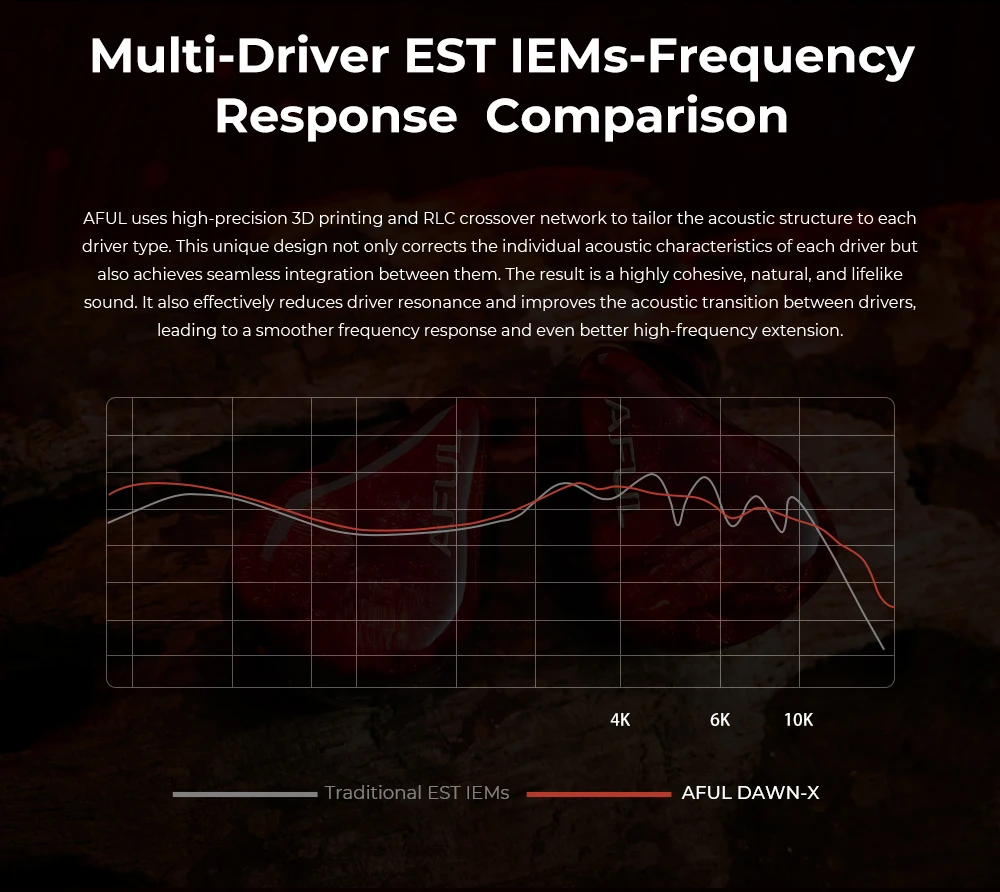 The AFUL DAWN-X is AFUL’s ultimate flagship, a 14-driver-per-side quad-brid in-ear monitor engineered with a 3D Micro-Resonant Acoustic Path, multi-dimensional 6-way crossover, and RLC network frequency-division correction. With wideband electrostatic coverage (≈5k–20k+), a high-damping air-pressure balance system, and solid-stabilized wooden faceplates, DAWN-X delivers a highly cohesive, natural, and lifelike sound that’s easy to drive yet truly reference-grade.