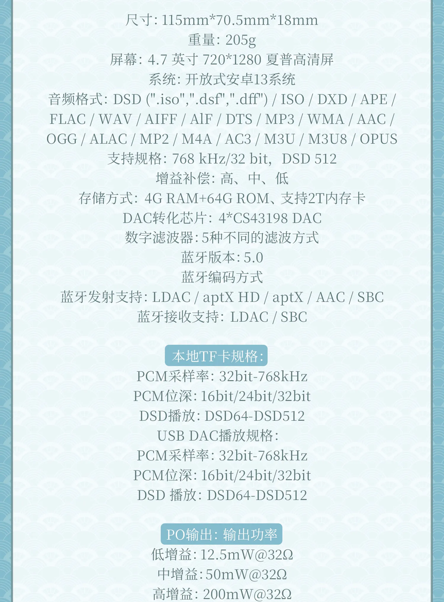 • Audio Format Support: DSD512, PCM768kHz, MP3, FLAC, WAV, APE, and more