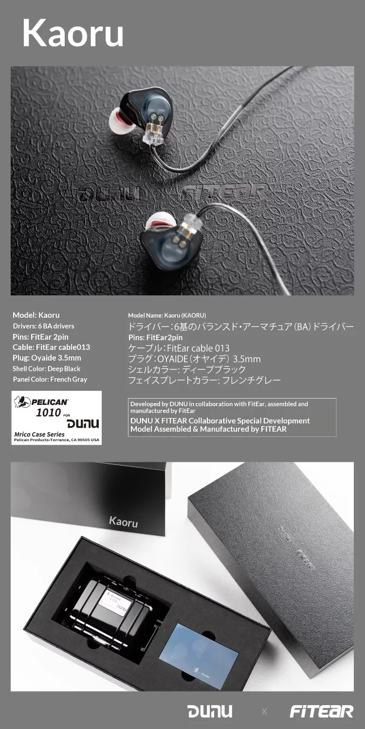 The DUNU × FitEar Kaoru is the product of two of the most respected names in high-end IEM design coming together for a single, uncompromising creation. DUNU brings its decades of multi-driver IEM engineering and award-winning sound tuning expertise; FitEar contributes its world-class CIEM cavity design, ergonomic shell geometry, and the iconic triple-structure elliptical nozzle that sets the Kaoru apart from any universal IEM on the market. The result is a 6BA-per-side in-ear monitor with a dark black inner cavity, French grey face panels, natural and lifelike vocals, effortless high-frequency extension, and a premium accessory package including the FitEar 013 stock cable, SpinFit CP100 and DUNU S&S ear tips, and a Pelican 1010 military-grade carry case.