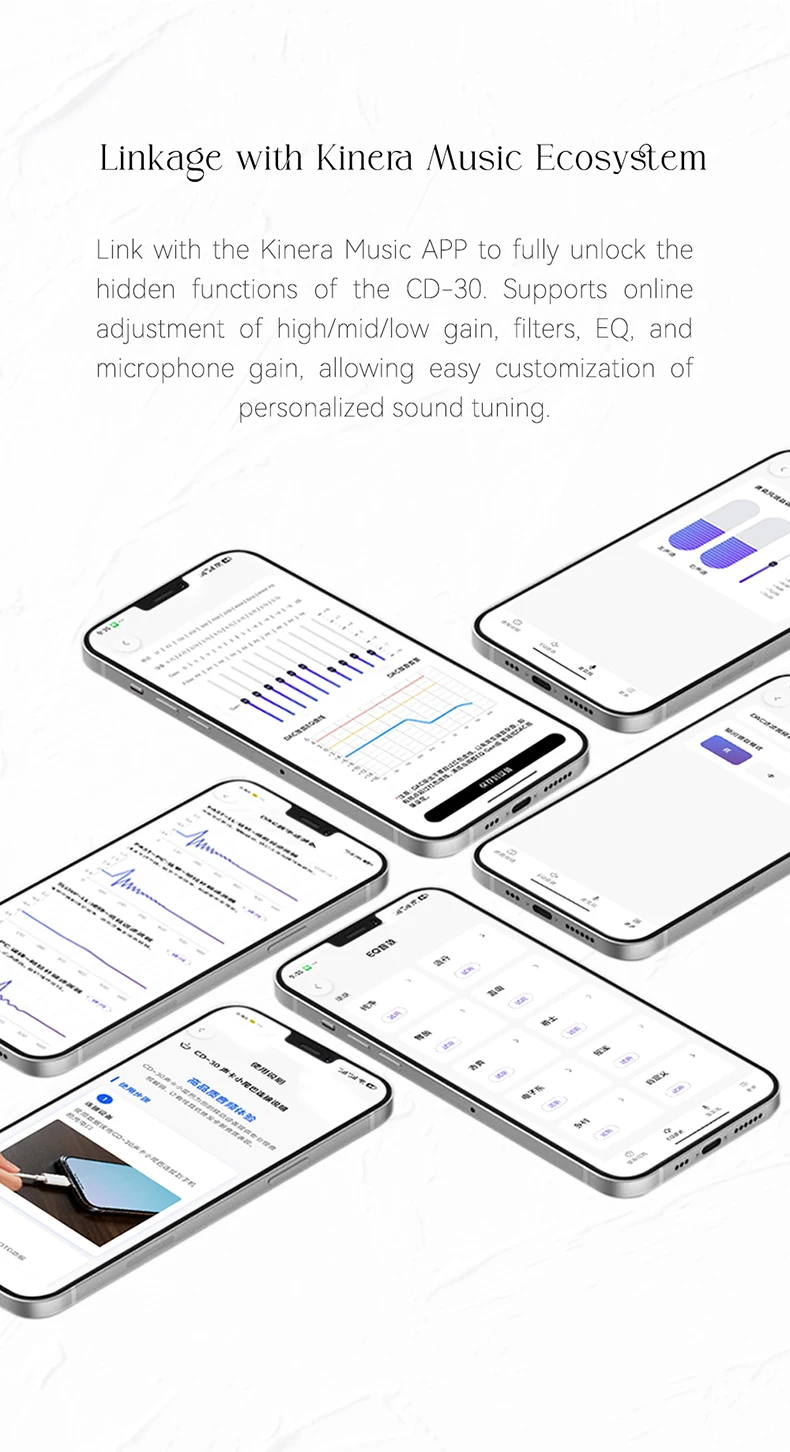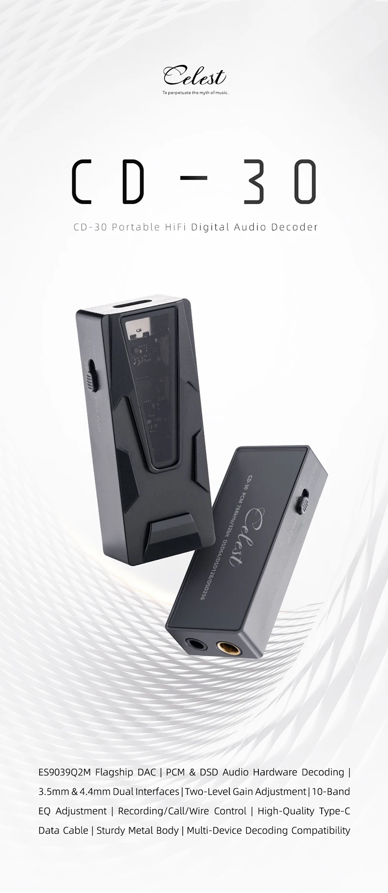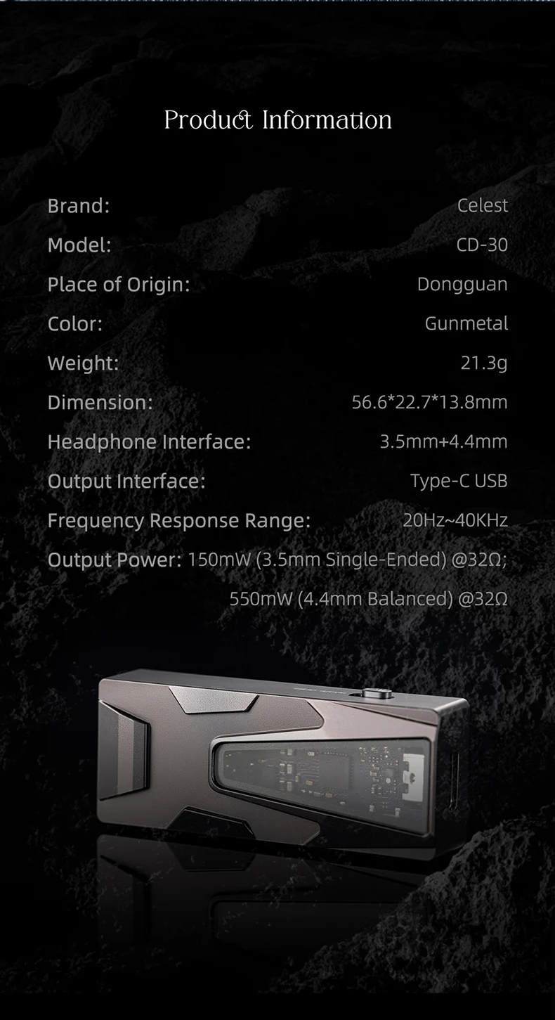 The Kinera Celest CD-30 is a portable USB DAC designed for listeners who want reference-level decoding in a pocket-friendly form factor. At its core is the ESS ES9039Q2M, a flagship-grade DAC chip capable of handling PCM up to 768kHz / 32-bit and DSD up to DSD512. The CD-30 offers both a 3.5mm single-ended and a 4.4mm balanced (Pentaconn) output, giving you the flexibility to drive a wide range of IEMs and headphones from your phone, tablet, or laptop. The all-metal chassis keeps the build rigid and interference-resistant, while the compact 56.6 × 22.7 × 13.8 mm footprint means it disappears into any pocket or bag.