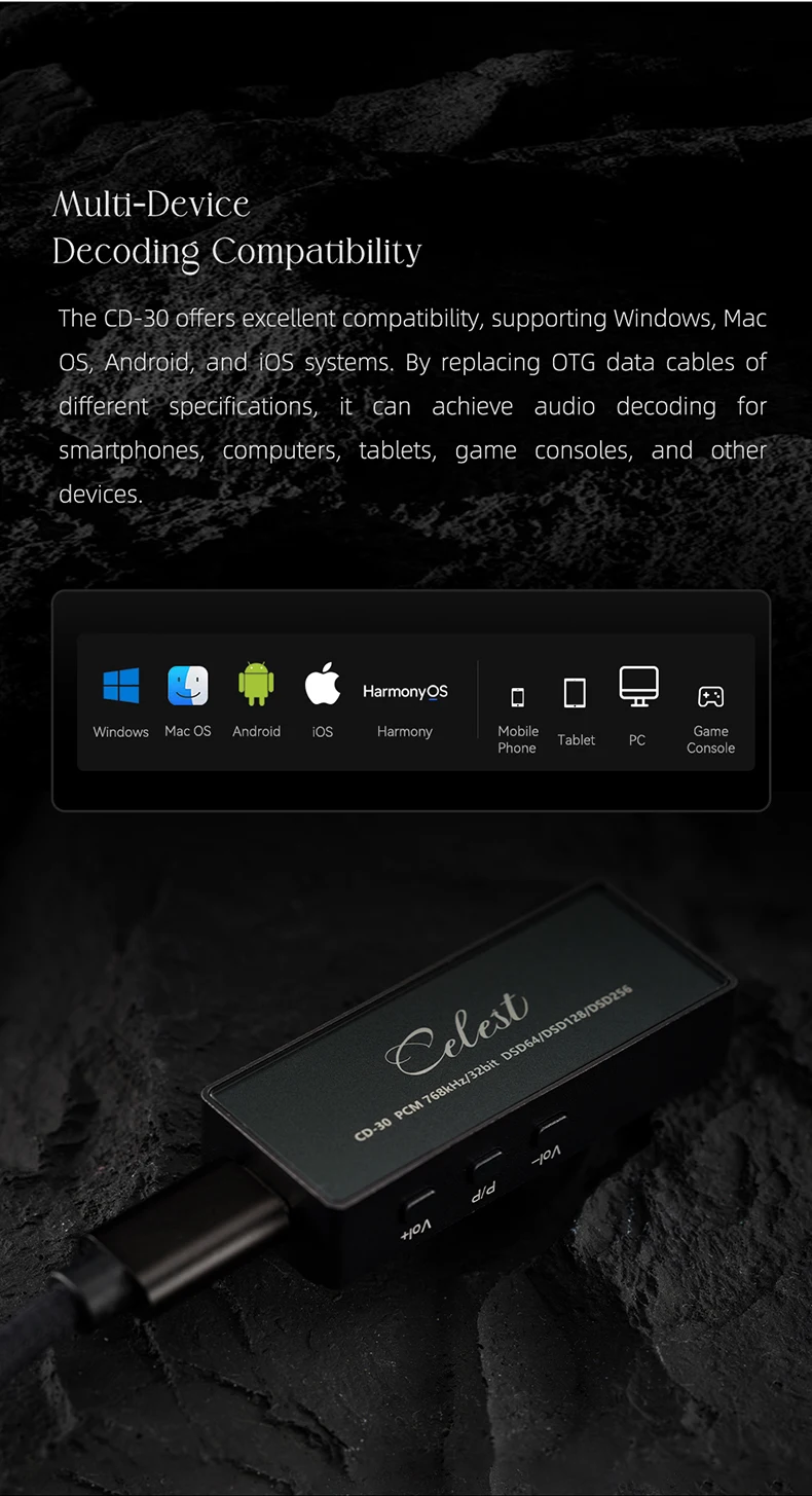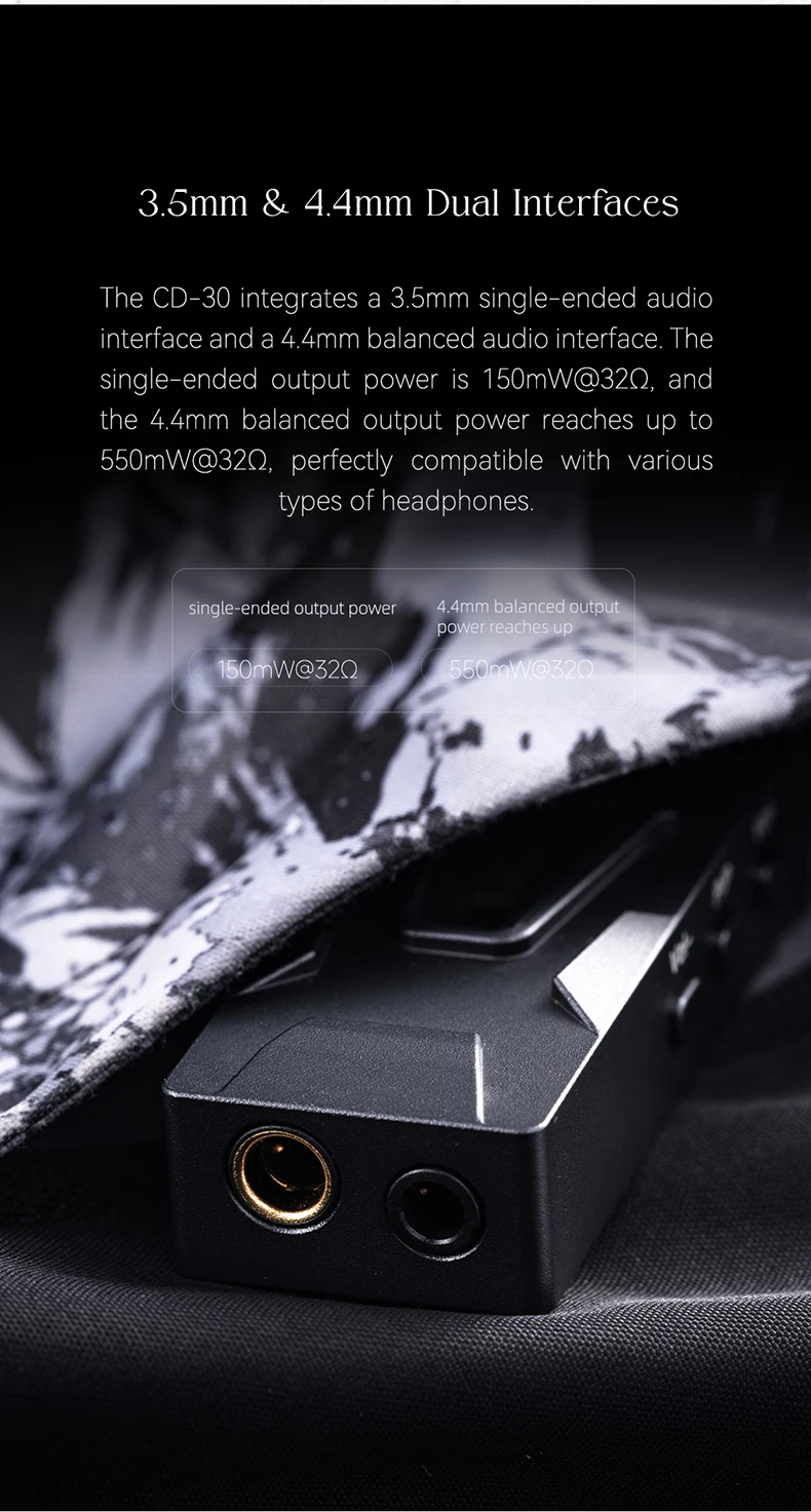 • USB Type-A Input — Universal Compatibility: The CD-30 connects via USB Type-A, making it immediately compatible with Android phones (via OTG adapter), laptops, desktop PCs, and any USB audio source. No drivers required on most platforms.