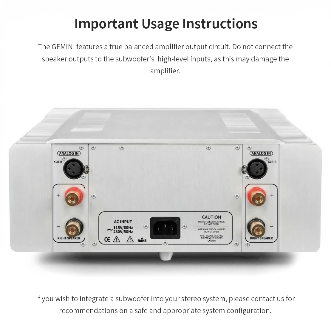 • Balanced XLR & Unbalanced RCA Inputs: The GEMINI accepts both balanced XLR and unbalanced RCA signals, making it compatible with virtually any preamplifier, DAC with volume control, or integrated source. Balanced operation further reduces noise and interference in longer cable runs.