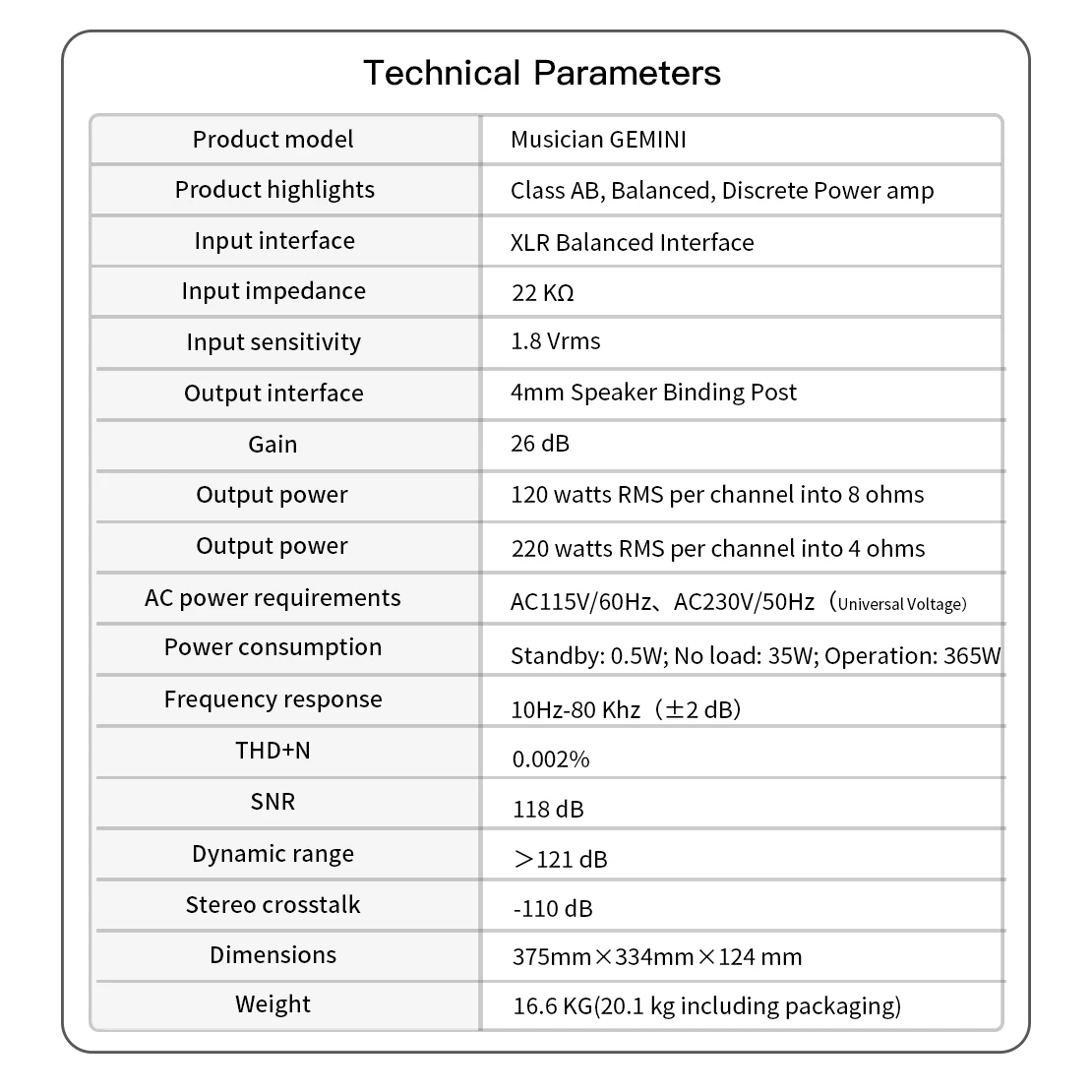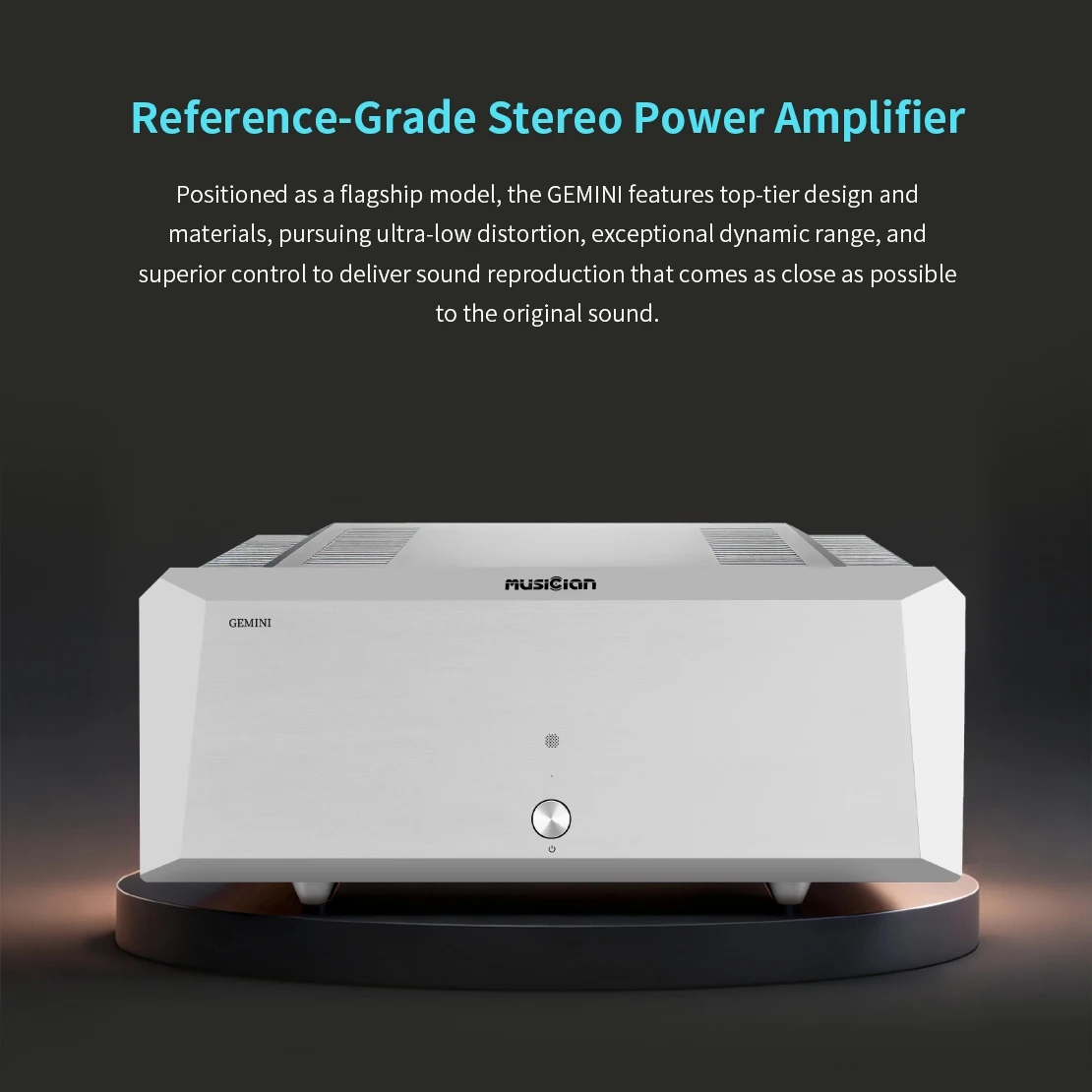 ⚠️ The MUSICIAN GEMINI is a power amplifier only and requires a separate preamplifier or DAC with volume control. It is not an integrated amplifier. Please verify your source chain before ordering. Pairs naturally with the MUSICIAN PEGASUS DAC and AQUARIUS DAC.