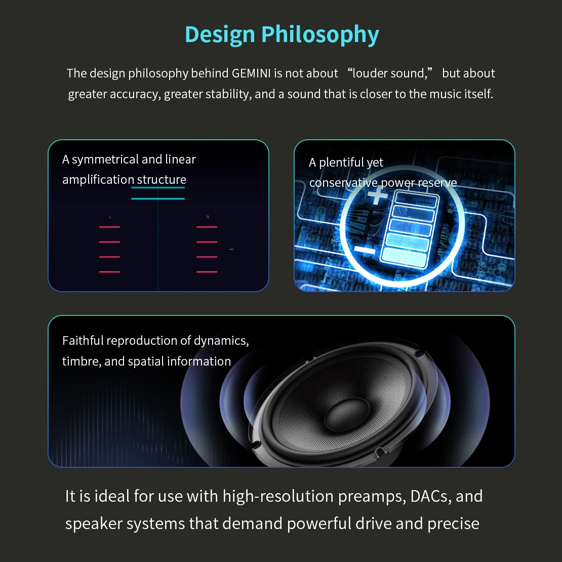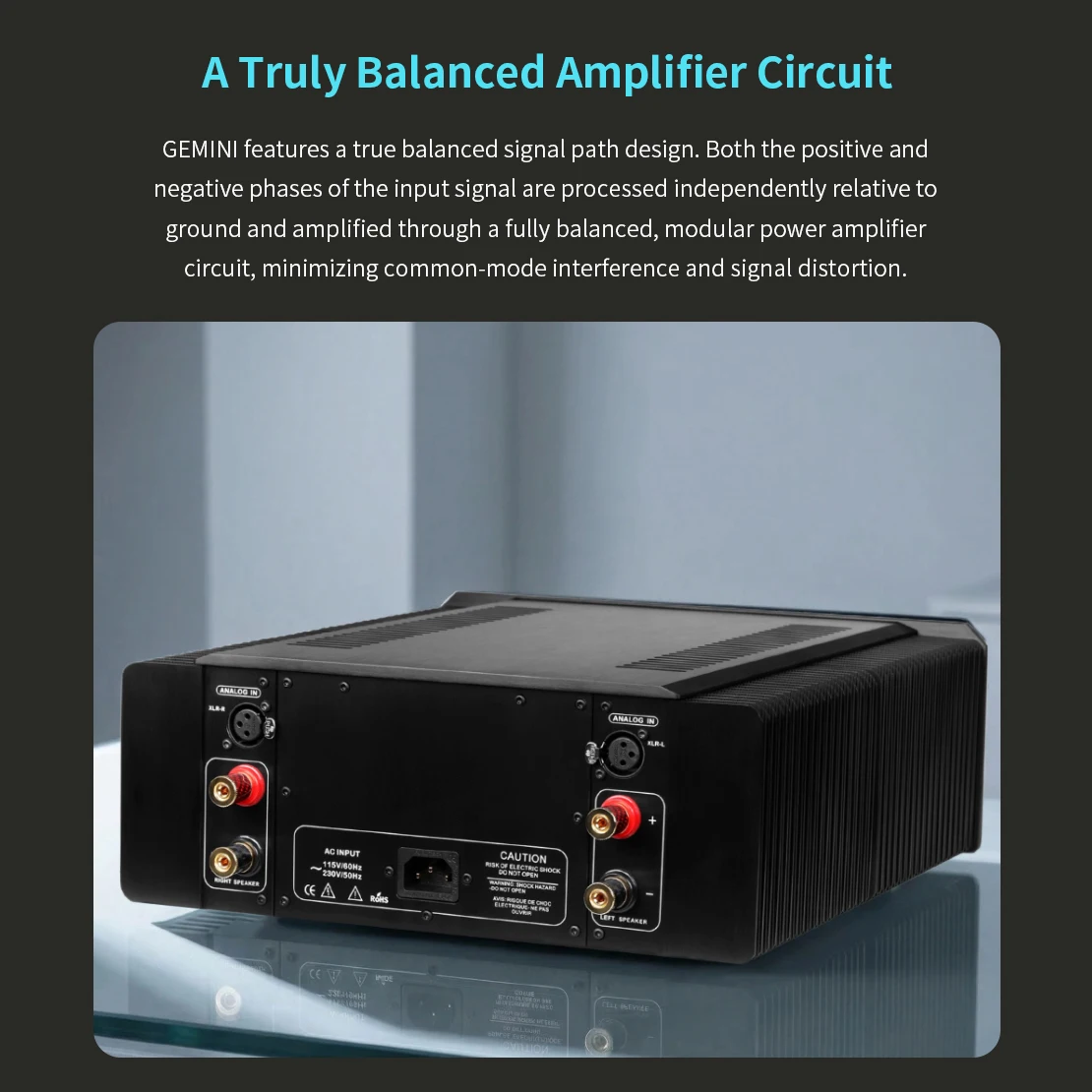 • Pure Class AB Topology — Optimal Efficiency and Linearity: The GEMINI operates in Class AB, striking the ideal balance between the warmth and low-distortion character of Class A and the efficiency of Class B. The result is low THD across the full power range, with no crossover distortion and a natural, musical presentation at any listening level.