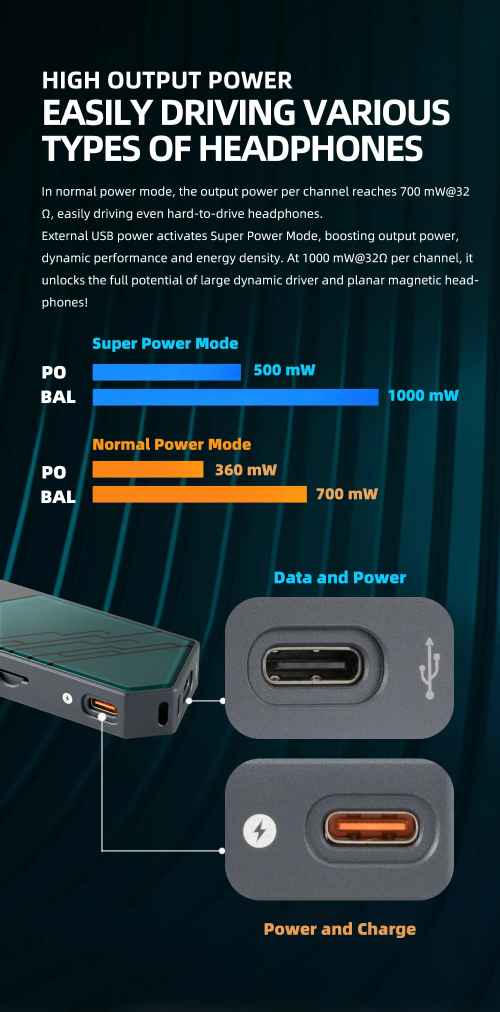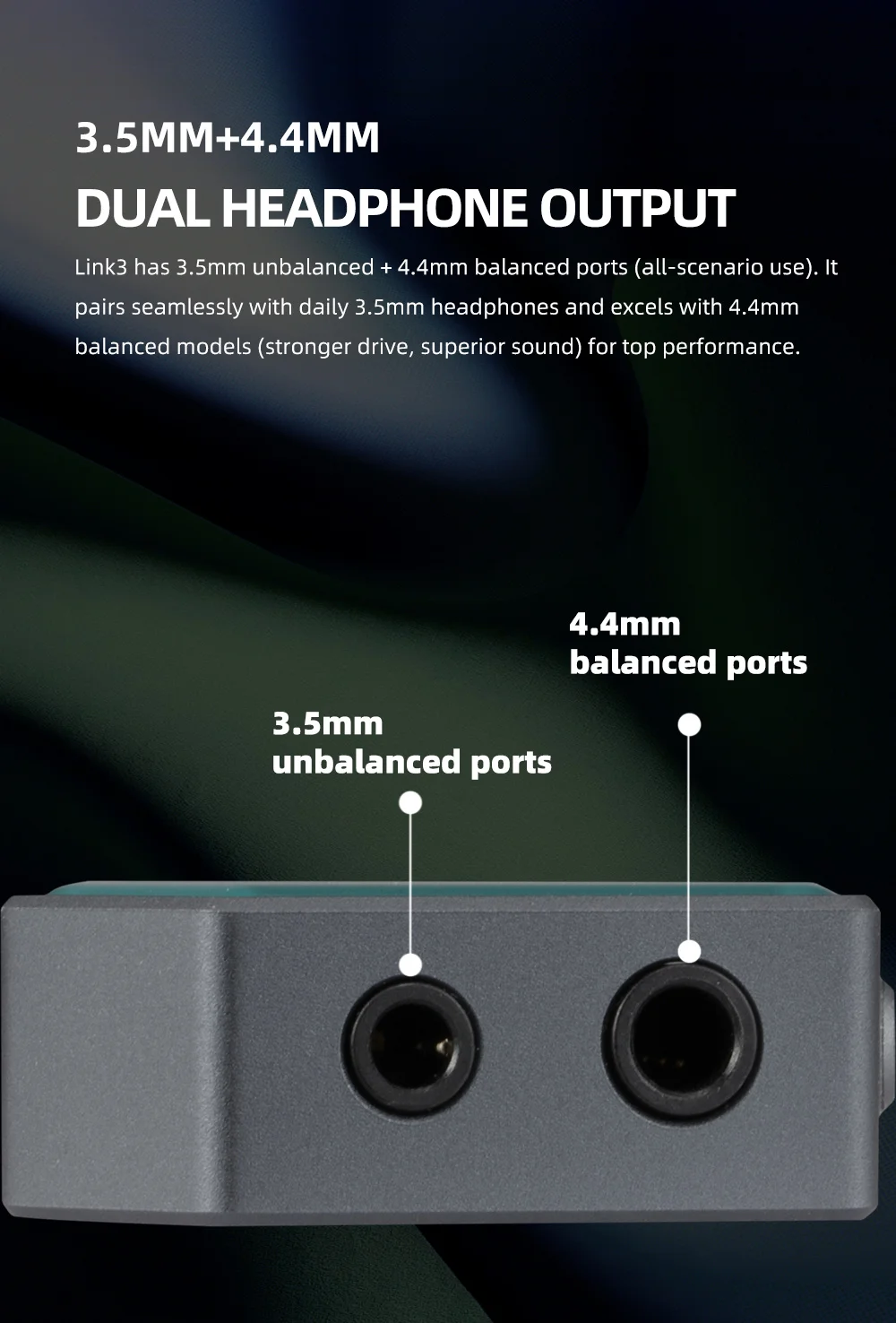 • 3.5mm Single-Ended + 4.4mm Balanced Output: Full output flexibility for both standard and balanced IEMs and headphones. The 4.4mm balanced stage delivers up to 240mW @ 32Ω—significantly higher than the single-ended output—with lower crosstalk and improved dynamics for demanding loads.