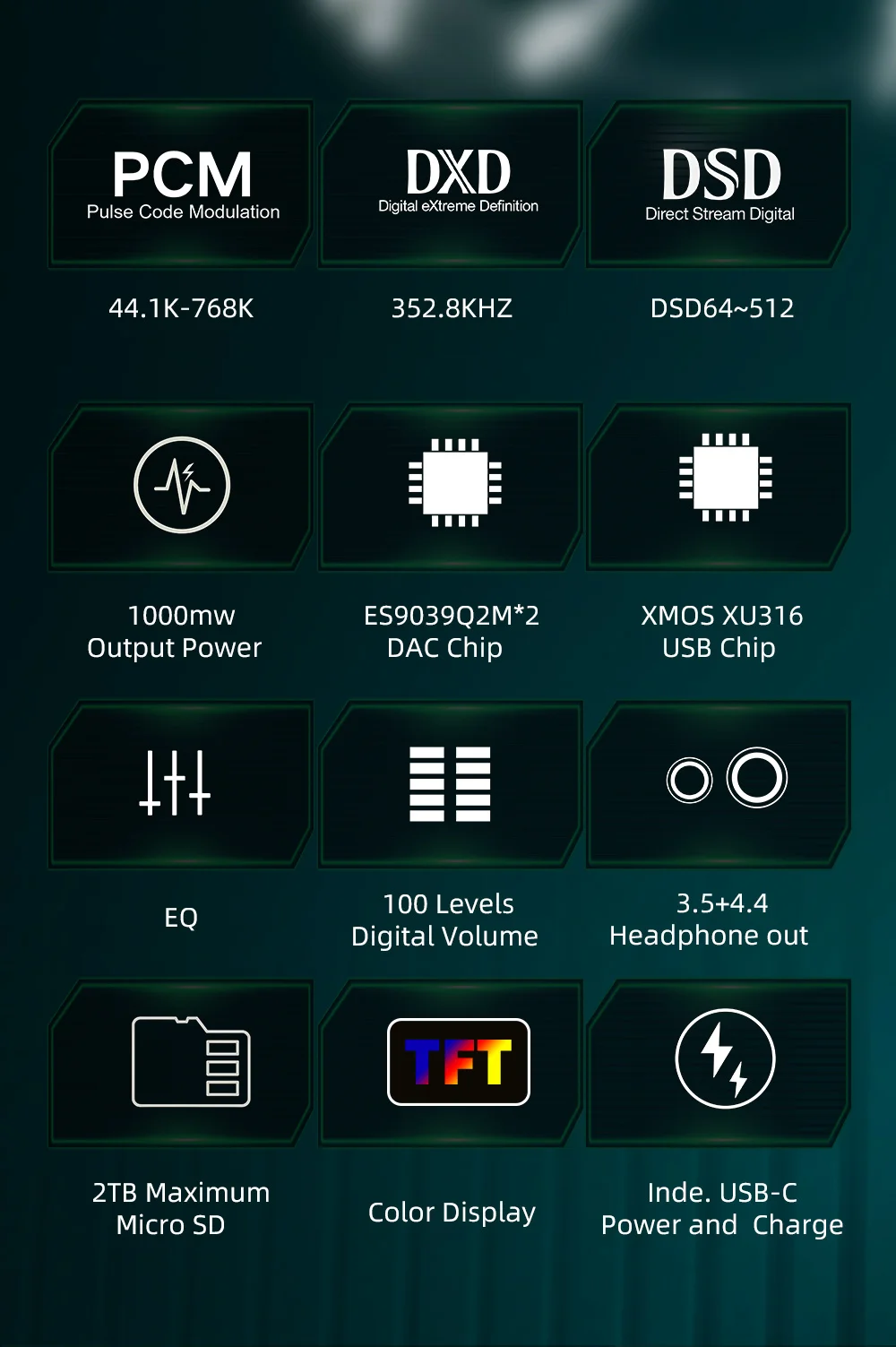 Dual ES9039Q2M DAC Chips 3.5mm Single-Ended Output 4.4mm Balanced Output PCM 384kHz / 32Bit DSD64 / DSD128 / DSD256 SNR ≥120dB THD+N ≤0.0003% Plug & Play — No Driver Required iOS / Android / Windows / macOS