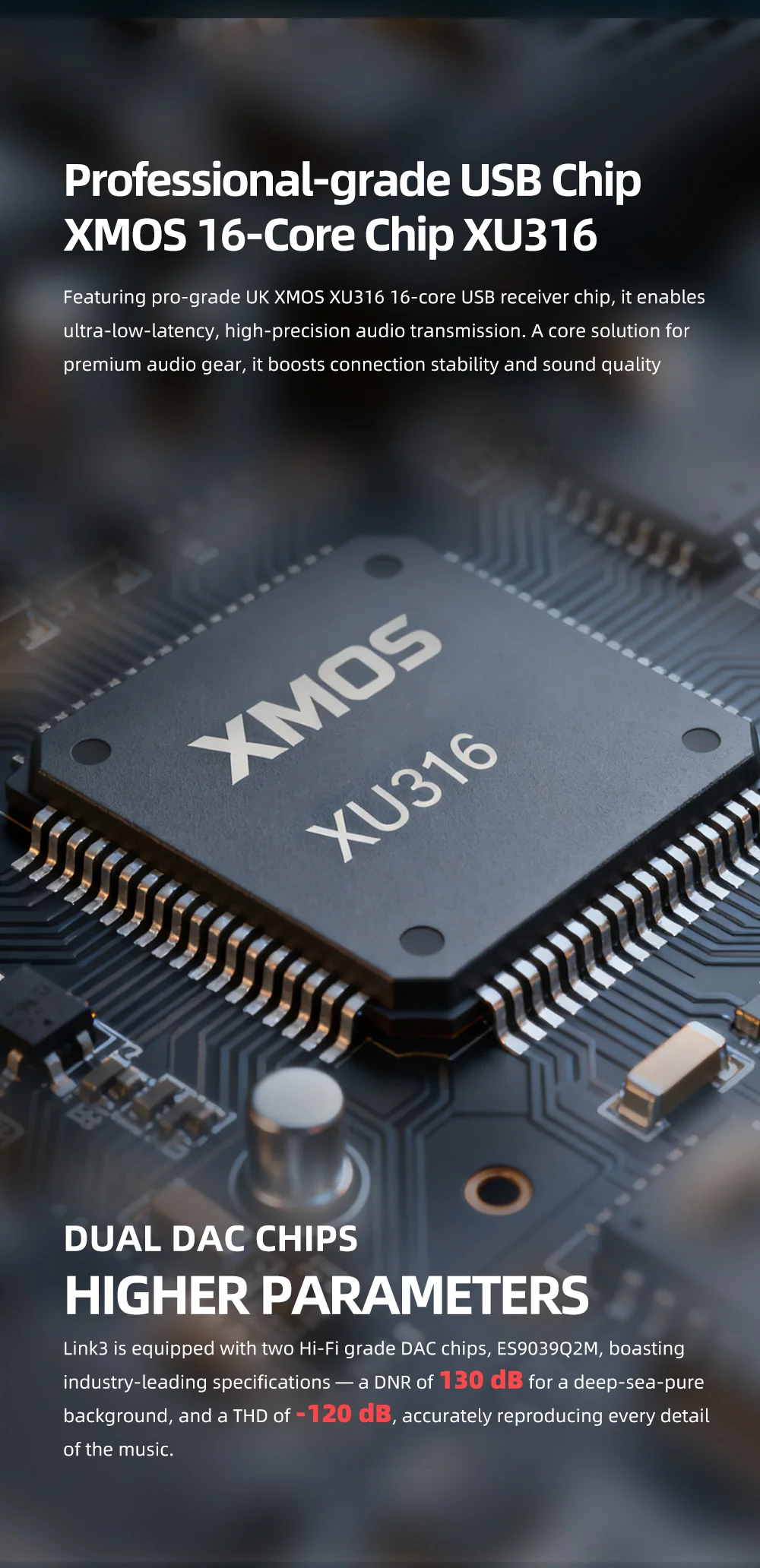 • Dual ES9039Q2M DAC Chips — Flagship-Grade Decoding: The LINK3 employs two ESS ES9039Q2M chips in a dual-mono configuration, delivering an ultra-low noise floor, exceptional channel separation, and a precise, immersive soundstage. This is the same chip family found in high-end desktop DACs, now in a dongle form factor.